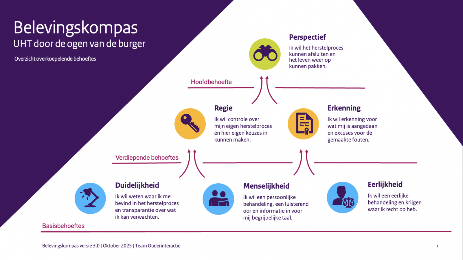 "Perspectief is de ultieme behoefte," beschrijft Laura. "Burgers willen het herstelproces afsluiten en hun leven weer oppakken. Maar daarvoor moeten we eerst voldoen aan basis- en verdiepende behoeften. Basisbehoeften gaan voornamelijk over contact: zijn we duidelijk genoeg, scheppen we de juiste verwachtingen? Bij verdiepende behoeften gaat het bijvoorbeeld over erkenning. We moeten durven zeggen dat er fouten zijn gemaakt en daar excuses voor aanbieden."